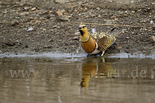 weitere Stichworte: Bad, Bathe, Birds, Flughühner, Mirror, Pin-tailed sandgrouse, Pterocles alchata, Pteroclidae, Spain, Spanien, Spiegelbild, Spießflughuhn, Tränke, Vögel, Watering place