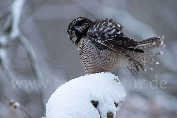 weitere Stichworte: Birds, Eulen, Hawk owl, Owls, Schnee, Snow, Sperbereule, Strigiformes, Surnia ulula, Vögel, Winter
