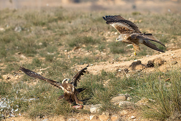 weitere Stichworte: Accipitriformes, Birds, Circus aeruginosus, Flight, Flug, Greifvögel, Juv., Juvenil, Marsh harrier, Milvus milvus, Raptors, Red kite, Rohrweihe, Roter milan, Rotmilan, Spain, Spanien, Vögel